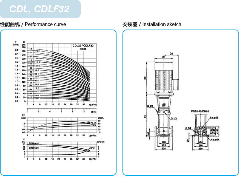 ◆ CDL/CDLF为安装标准电机的非自吸立式多级离心泵,电机轴通过泵头用联轴器直接与泵轴联接,拉杆螺栓将耐压筒、过流部件固定在泵头和进出水段之间,泵进出水口在泵底同一直线上;本泵可根据需要配置智能保护器,对泵干转、缺相、过载等进行有效保护。
