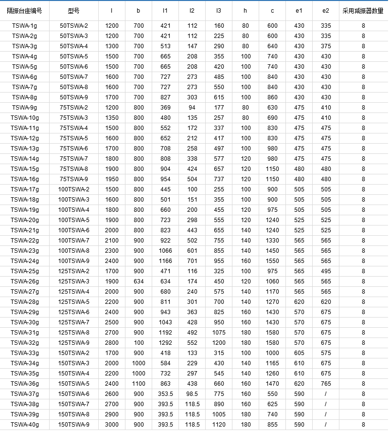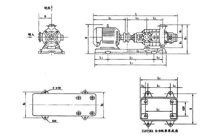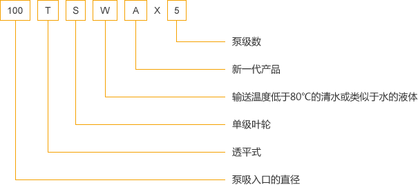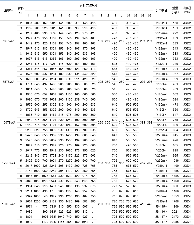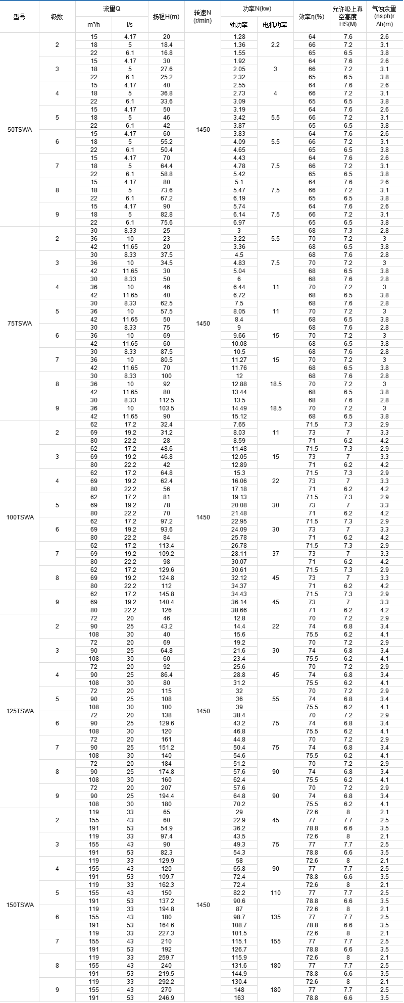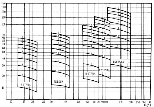 TSWA型多级离心泵全系列共5个品种40个规格,其性能范围流量Q=1.5~191m³/h,扬程h=17~247m,转速n=1450r/min。