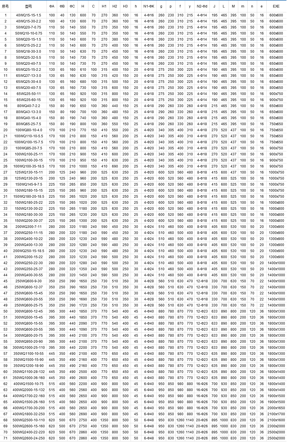 WQ型污水污物潜水泵是目前国内较先进与理想的排水机具。该泵采用旋流式的下吸结构,具有不怕堵塞,耐磨损、运行可靠、维修方便、排水彻底,适用范围广泛等突出优点,较好解决了PN浓浆泵不能抽吸重量较大的颗粒以及PW、PWA污水泵易堵塞的难题。