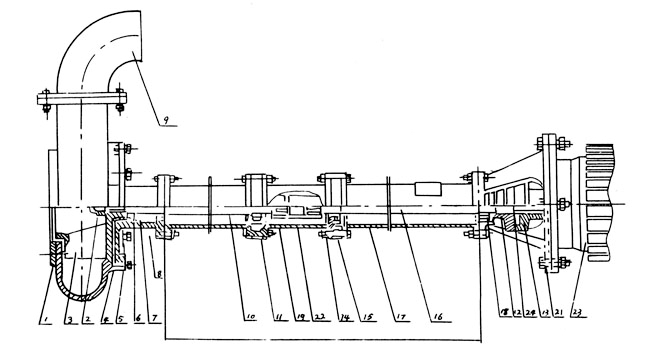 本泵系单级单吸立式离心泵,流体沿泵轴的轴线成70°方向流出,主要部件有蜗壳、叶轮、泵座、泵壳、支撑筒、电机座、电动机等。蜗壳、泵座、电机座、叶轮螺母是生铁铸造,耐磨性、耐腐蚀性较好,加工工艺方便。