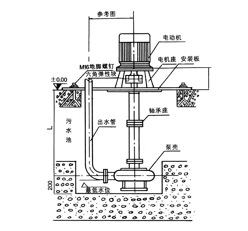 本泵可垂直或倾斜使用,占地面积小,蜗壳需埋在工作介质中工作,容易启动,不需引水,旋转方向应从电机尾部看是顺时针方向工作。