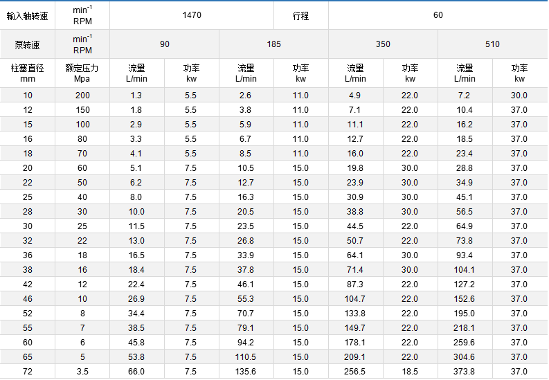 适用于试压泵、清洗泵、计量泵、流程泵、加药泵、液压泵、输油泵、料浆泵、液态二氧化碳泵。 组装型式:有卧式、立式、固定式、移动式。 传动型式:有电动机、柴油机、齿轮箱、皮带轮、电磁调速、变频调速。 表中技术参数作为选型参考,每个品种的泵都装有安全调压阀,泵的压力可任意调节。 你选型时表中流量不合适,可用电磁调速,变频调速,变换柱塞直径来调节流量,满足选型需要。 泵体材料有合金钢、马氏体、奥氏体不锈钢、316、316L双相钢。