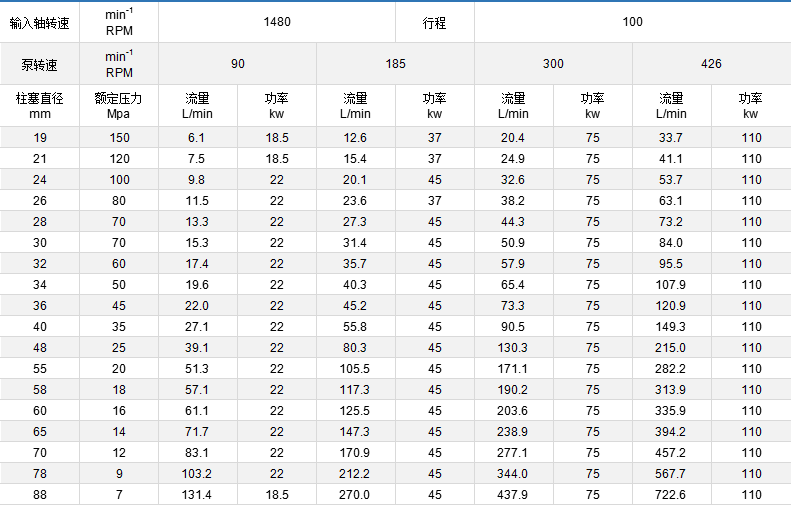 适用于清洗泵、流程泵、尿素铜液泵、基甲酸铵液二甲泵、液态二氧化碳泵、食品均质泵、洗涤剂料浆泵、氨水泵、料浆泵、增压泵、注水泵、除磷泵、输油泵、除锈泵。 组装形式:有卧式、立式、固定式、移动式。 传动形式:有电动机、柴油机、齿轮箱、皮带轮、电磁调速、变频调速。 表中技术参数作为选型参考,每个品种的泵都装有安全调压阀,泵的压力可任意调节。 你选型时表中流量不合适,可用电磁调速,变频调速,变换柱塞直径来调节流量,满足选型需要。 泵体材料有合金钢、马氏体、奥氏体不锈钢、316、316L双相钢。