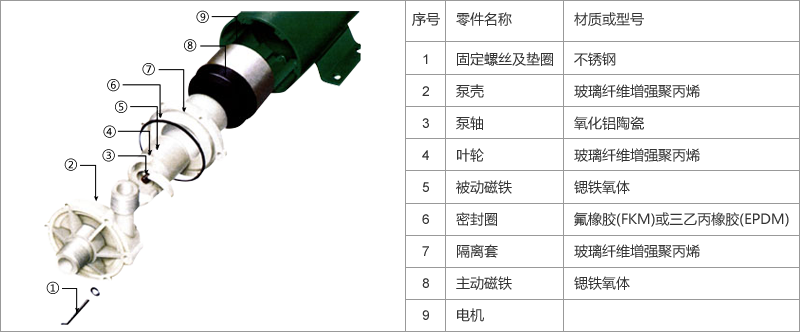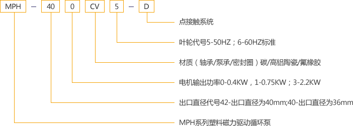 MPH型塑料磁力泵符合JB/T7742-1995《小型磁力传动离心泵》标准,过流部件采用聚苯硫醚(PPS),不受大多数酸、碱、盐的侵蚀(除氧化性酸如浓硫酸、硝酸和王水等),其性能接近于聚四氟乙烯的化学性能,在100℃以下能耐大多数有机溶剂,特别能耐汽油和甲醇的混合液,是酸碱工业中的理想用泵。