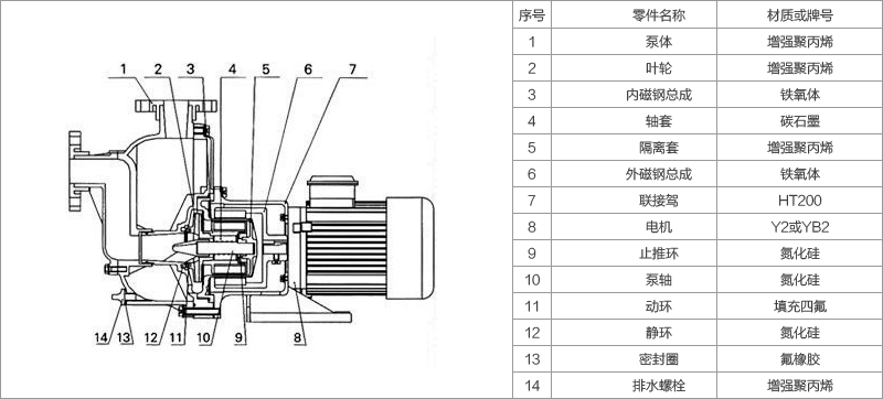 过流部件材质:PP(增强聚丙烯)、PVF2(聚偏二氟乙烯)